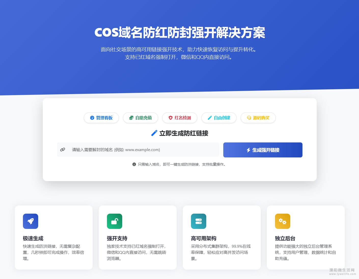 1. 极速生成与强开支持 无需复杂的服务器配置,只需输入您的原始域名(如 www.example.com ),系统即可一键生成防红链接。